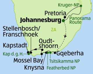 Napfényes, kozmopolita, színes. Üdvözöljük Dél-Afrikában! A „szivárvány nemzet” méltó a nevéhez, és sokszínű utazásra viszi Önt a kultúra és a természet legszebb helyeire. Johannesburgban, Pretoriában és Fokvárosban a múlt nyomába eredhet. Itt felfedezheti az ország történelmét. A Kruger Nemzeti Park Dél-Afrika legnagyobb állatrezervátuma. Kis szerencsével egy szafaritúrán találkozhat a „Big Five” elefánttal, oroszlánnal, bivalyokkal, oroszlánnal és leopárddal. Ugyanilyen lenyűgöző Port Elizabeth és az utazás a híres Garden Route mentén. Mi nem hiányozhat ebből az utazásból? Természetesen egy látogatás a világhírű borvidékeken, bor kóstolással. A túra legfontosabb látnivalói: a Blyde River Canyon, a Jóreménység-fok panorámája és még sok más.